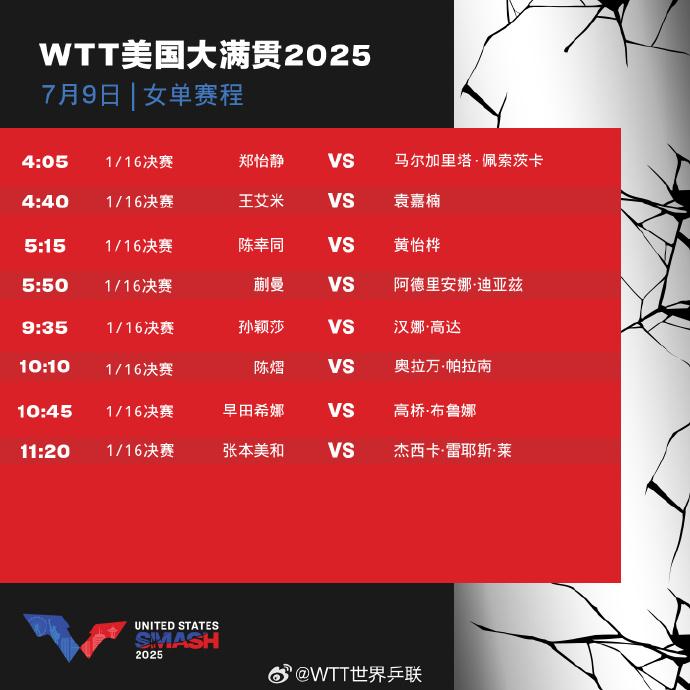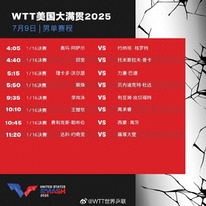 WTT美國大滿貫7月9日賽程公布。王楚欽、孫穎莎、陳幸同、蒯曼、林詩棟等將分別亮相。