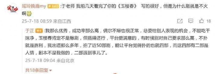 當(dāng)制作人成了自家成績(jī)單的唯一判官,"撲街"的定義便徹底淪為玄學(xué)。在于正的標(biāo)準(zhǔn)里,大概只要沒賠到當(dāng)褲子,或憑伶牙俐齒把黑紅也包裝成流量,就能算"成功上岸"。至于豆瓣開分3.8?那是"觀眾不懂欣賞"。收視率跌穿底盤?"平臺(tái)排播的鍋"。網(wǎng)絡(luò)播放量注水成海?"對(duì)家眼紅買黑通稿"!