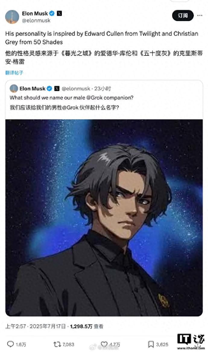 Grok 剛推出名為 Ani 的 AI“女友”幾天后,馬斯克又開始預(yù)告為女性用戶量身打造的“AI 男友”。從馬斯克的推文獲悉,這個角色設(shè)定憂郁、黑發(fā),其性格靈感源自《暮光之城》的愛德華?卡倫和《五十度灰》的克里斯蒂安?格雷。