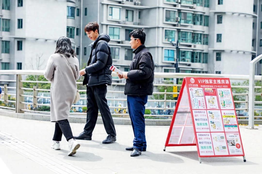 2025年4月,上海一房產(chǎn)中介的工作人員走上街頭推銷二手房。本文圖/視覺中國