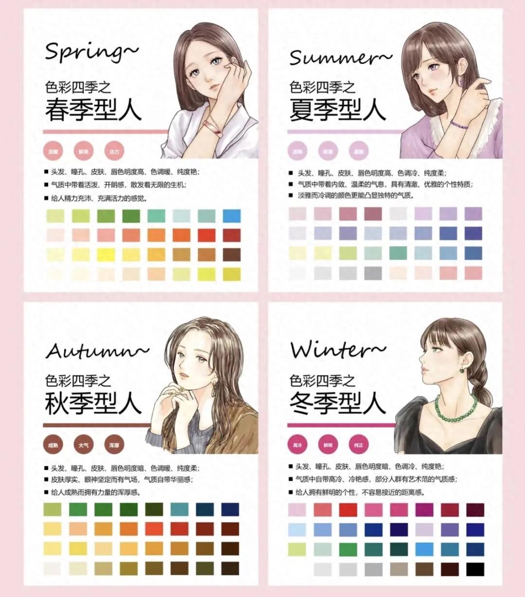 這句話(huà)里面的春夏秋冬,不是什么氣候知識(shí),而是近年來(lái)被不少明星、網(wǎng)紅打卡過(guò)的“色彩診斷”。它主要通過(guò)分析個(gè)人膚色、發(fā)色和瞳孔顏色之間的關(guān)系,再結(jié)合色彩學(xué)從而劃分出不同的類(lèi)型,大的分類(lèi)是4類(lèi)——春季型、夏季型、秋季型、冬季型。