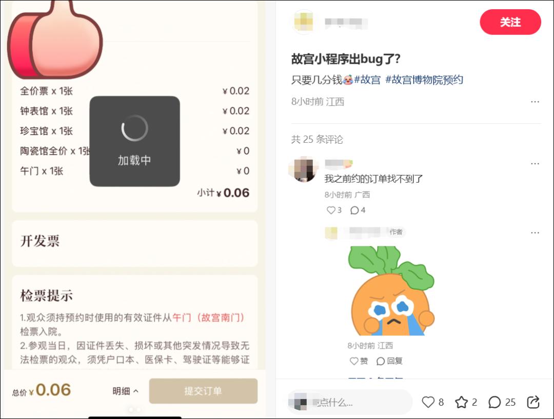 7月22日凌晨,部分網友反映“故宮小程序出bug”,2分錢就可以買一張門票:
