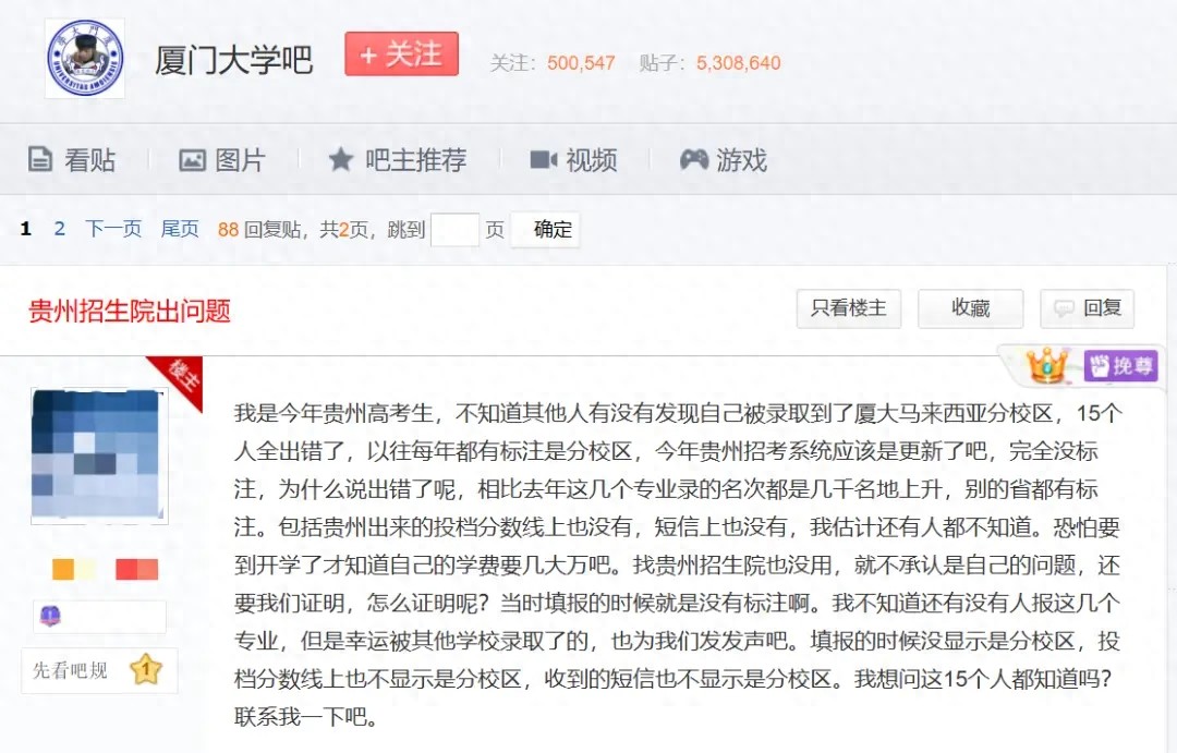 7月23日,IP地址顯示為貴州的網友發帖稱,今年高考填報志愿時,廈門大學與廈門大學馬來西亞分校在系統中僅以專業代碼區分,未明確標注“海外分校"字樣,導致其被廈門大學馬來西亞分校錄取。該考生今年高考成績609分,本以為被廈門大學本部錄取,結果發現是被馬來西亞分校錄取。