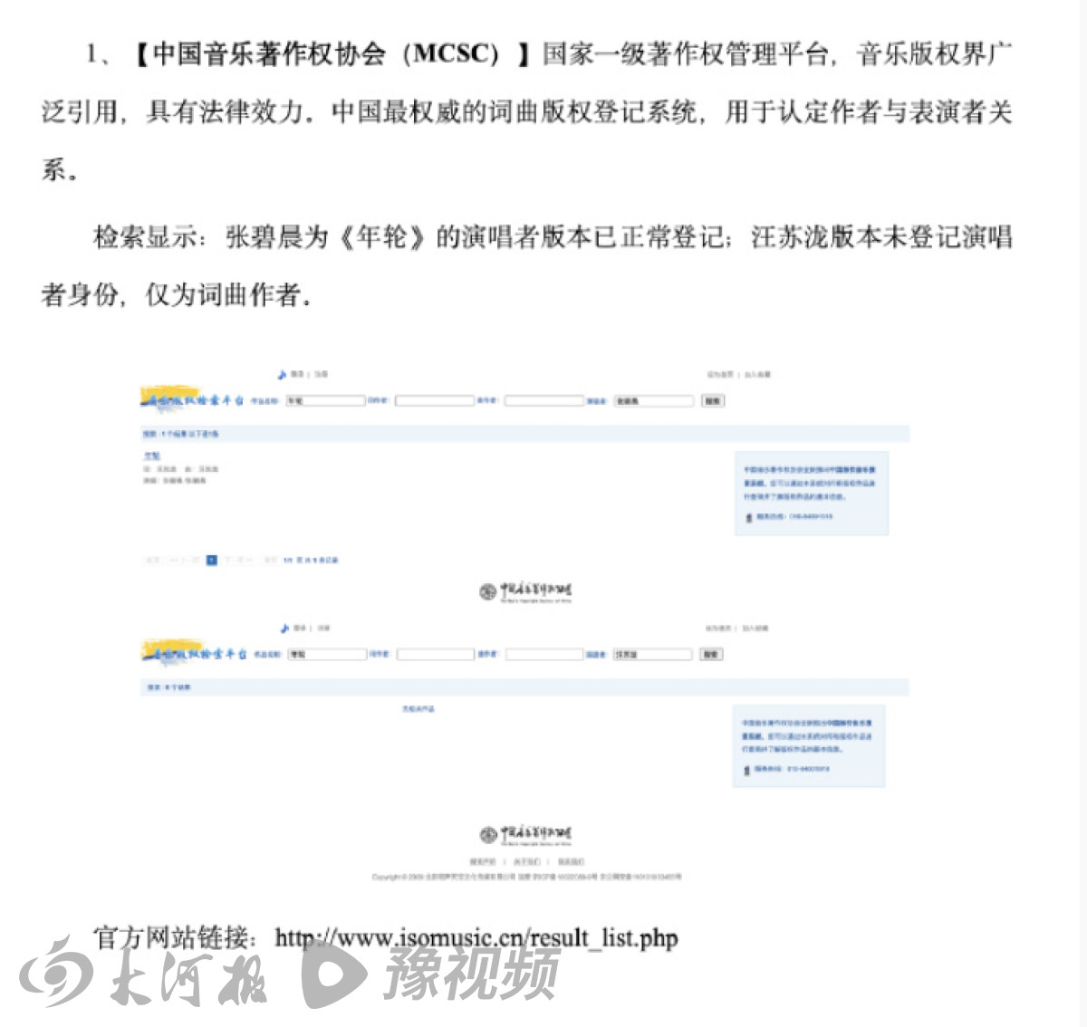 張碧晨工作室發布的張碧晨《年輪》在相關協會的登記記錄