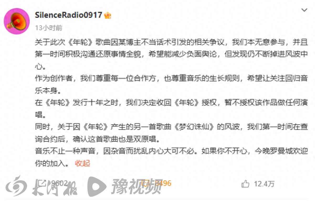 面對爭議,7月25日0:05,汪蘇瀧方發文稱:“在《年輪》發行十年之時,我們決定收回《年輪》授權,暫不授權該作品做任何演唱。”2小時后,張碧晨工作室發微博告別《年輪》,強調“張碧晨女士作為該作品唯一原唱”,并貼出相關證明材料和時間線。