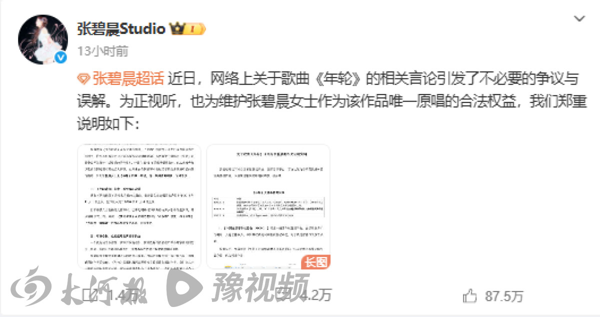 張碧晨工作室發文截圖