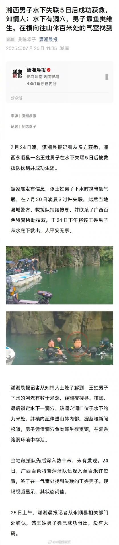 7月24日晚,據(jù)瀟湘晨報(bào),湘西永順縣一名王姓男子在水下失聯(lián)5日后被救援隊(duì)找到并成功生還。據(jù)家屬發(fā)布信息,該王姓男子下水時(shí)攜帶氧氣瓶,在7月20日凌晨3時(shí)許失聯(lián),此后當(dāng)?shù)乜h城警方、救援隊(duì)持續(xù)搜尋,并聯(lián)系了廣西百色特警協(xié)助搜救,于24日下午將該王姓男子從水底下救出,人平安無(wú)事。