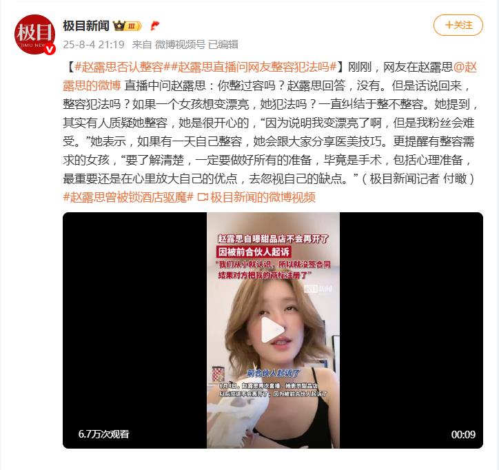整容犯法嗎?一個(gè)女生想變漂亮犯法嗎?”——趙露思在直播中直接開(kāi)懟網(wǎng)友的整容提問(wèn),瞬間點(diǎn)燃熱搜。這番硬核回應(yīng)不僅讓粉絲直呼“姐姐好剛”,更掀起了關(guān)于女性容貌自主權(quán)的激烈討論。