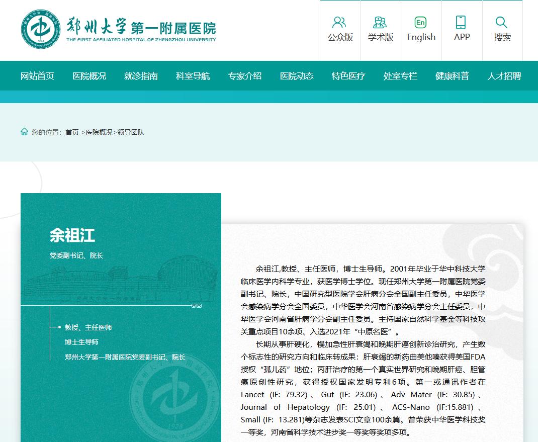 “長安街知事”微信公號消息,鄭州大學(xué)第一附屬醫(yī)院網(wǎng)站近日更新顯示,余祖江已任該院黨委副書記、院長。
