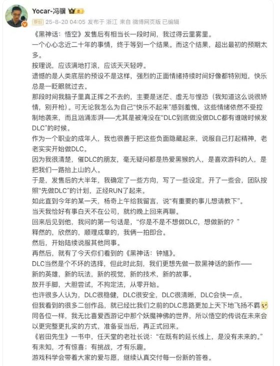 游戲科學創始人、CEO,《黑神話:悟空》制作人馮驥發文解釋為何推出新作。他表示,《黑神話:悟空》發售后有相當長一段時間,他過得云里霧里。DLC當然是個不壞的選擇,但此時此刻,他們更想先做一款黑神話的新作——新的英雄,新的玩法,新的視覺,新的技術,新的故事。他補充說,“悟空的傳說在未來會以更完整更扎實的方式,準備妥當后,再正式回來。”