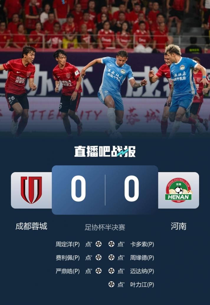 8月19日訊 北京時間8月19日19:35,足協杯半決賽,成都蓉城在五糧液體育文化中心體育場迎戰河南隊。上半場,阿奇姆彭奔襲后抽射中柱,馬亞鏟倒費利佩染黃;下半場,馬亞頭球中柱,王國明補時精彩兩連撲。雙方戰成0-0平進入加時賽,加時賽30分鐘兩隊仍未破門,比賽通過點球決勝。點球大戰,羅慕洛、馬亞失點,王國明撲出萊切特點球。最終,河南隊4-3擊敗蓉城,率先闖入足協杯決賽。