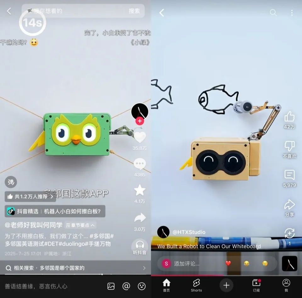 而HTX Studio在海外發布的對應視頻均刪去了品牌植入內容。例如,智能垃圾桶、智能黑板擦的海外版視頻分別刪去了海爾洗烘套裝廣告、多鄰國植入廣告。