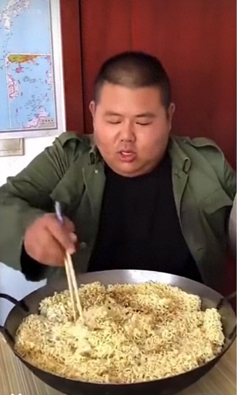 ▲良子曾一頓吃下16袋泡面,面條幾乎把整口鍋都填滿了。他以驚人的食量走紅網絡。 良子直播間視頻截圖