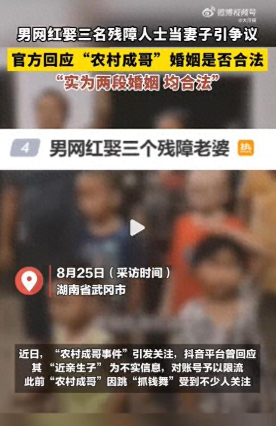 近日,有網友投訴博主“農村成哥”娶三個殘障老婆并生育孩子一事引發關注。涉事平臺回應其“近親生子”為不實信息,對相關賬號予以限流。但公眾仍質疑“成哥”婚姻的合法性,是否侵犯殘障人士和未成年人權益。8月25日,湖南省武岡市相關部門回應稱:網傳“成哥娶三名殘障人士當妻子”消息不實,實際為兩段婚姻,均合法。同日,武岡市殘聯稱,其家庭享受到了殘疾人政策;當地民政部門以涉及個人隱私為由,未在電話中回應“成哥”婚姻登記情況。(據8月25日大河報)