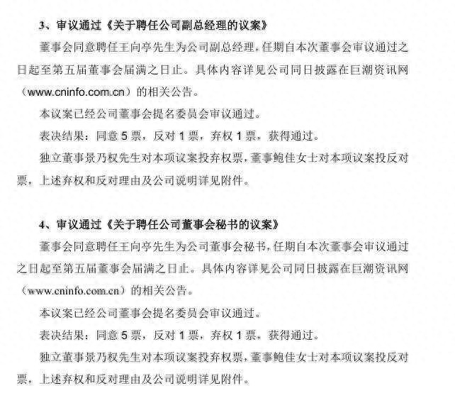 獨立董事景乃權對上述兩項議案表決進行了棄權,理由是:工作還需細心,提高專業性。而董事鮑佳則均投出了反對票。