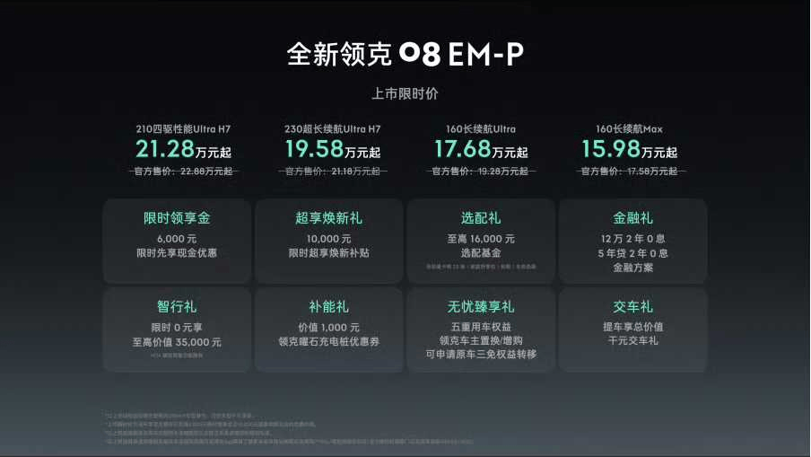 近日,上海發(fā)布會現(xiàn)場,領(lǐng)克正式宣布全新領(lǐng)克08 EM-P上市。四款配置車型的官方售價區(qū)間為17.58-22.88萬元,但限時售價下探至15.98-21.28萬元。