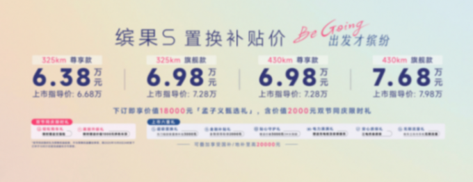 繽果S共推出325km尊享款、325km旗艦款、430km尊享款、430km旗艦款四款配置,上市指導(dǎo)價(jià)為6.68萬-7.98萬元,疊加置換政策可享置換補(bǔ)貼價(jià)6.38萬-7.68萬元,更可疊加享受至高20,000元的國家/地方購車補(bǔ)貼。