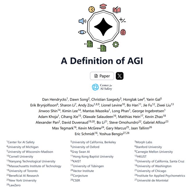 GPT-5算不算AGI?AGI到底來沒來?如來!面對各說各話的局面,我們迫切需要一個圖靈測試式的權(quán)威標準來定義AGI。獨立第三方非營利性AI研究機構(gòu),同時也是主流LLM評測標準HLE(Humanity's Last Exam,人類的最后考試)的提出者,AI安全中心(Center for AI Safety)的Dan Hendrycks和Yoshua Bengio等一眾頂尖AI學(xué)者,于昨天發(fā)布了論文《A Definition of AGI》,給出了他們對AGI的定義,試圖讓AI研究機構(gòu)和公眾厘清通往AGI的真正方向。