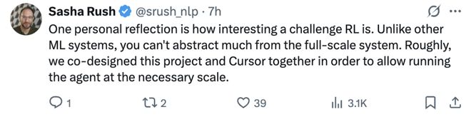 • 和其他機器學習方法不同,強化學習幾乎無法從完整系統里抽象出太多內容。所以我們讓Composer和Cursor一同設計,確保它能在真實規模下順暢運行。