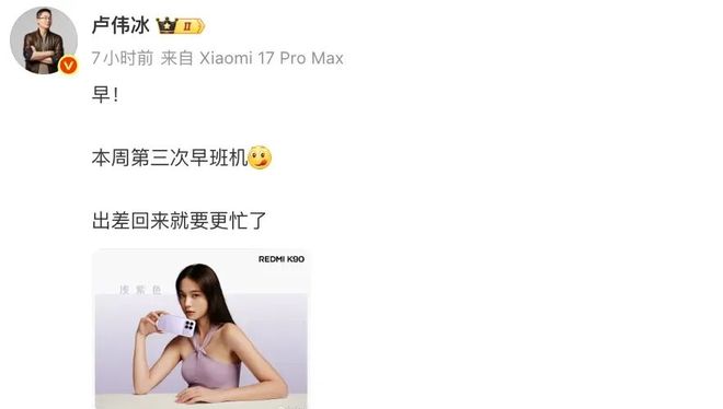 今天,小米集團合伙人、總裁,手機部總裁,小米品牌總經理盧偉冰發文透露“出差回來就要更忙了”。